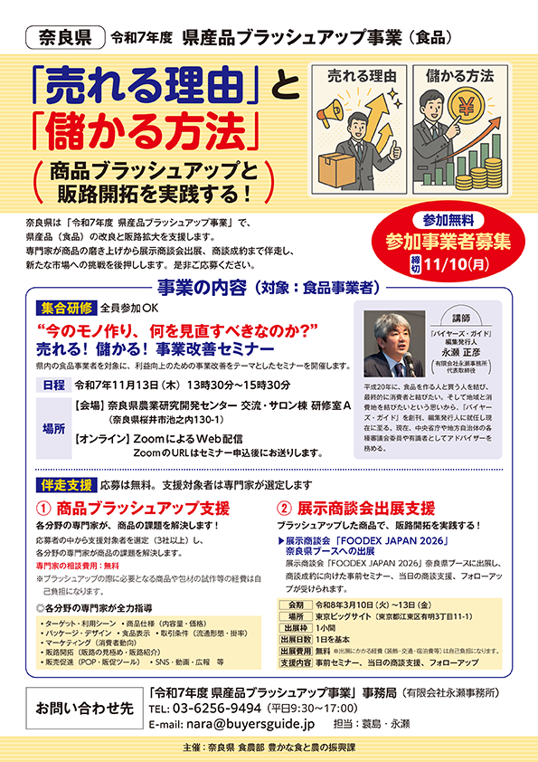 奈良県は「令和7年度 県産品ブラッシュアップ事業」で、県産品(食品)の改良と販路拡大を支援します。
